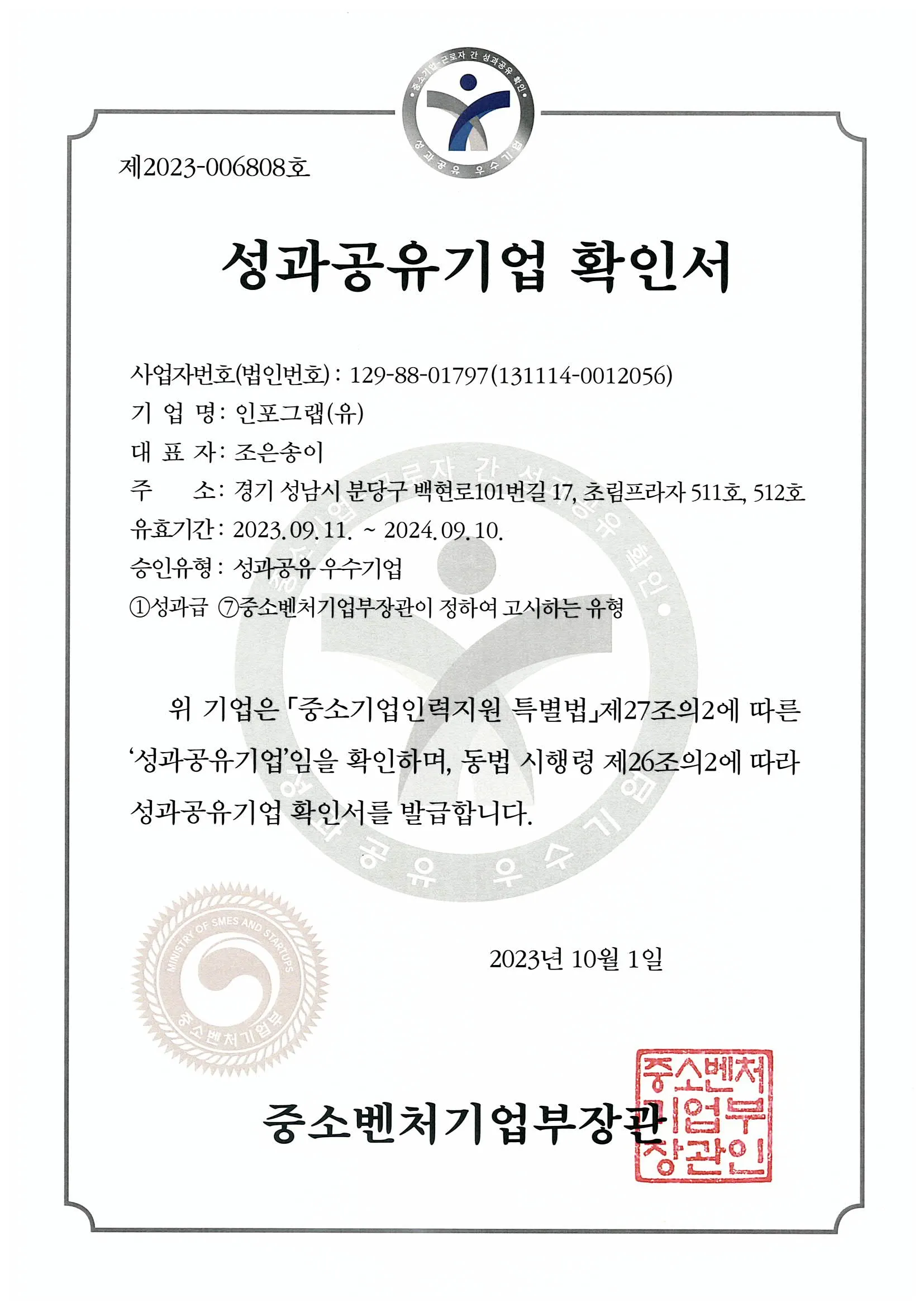 이 점을 인정받아 성과공유 우수기업으로 선정 되었습니다.