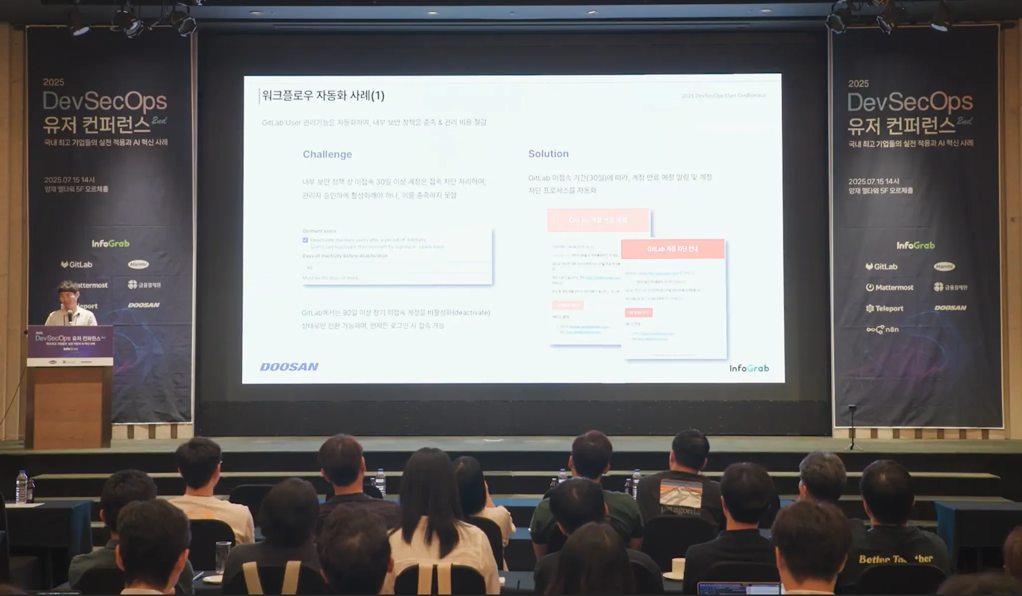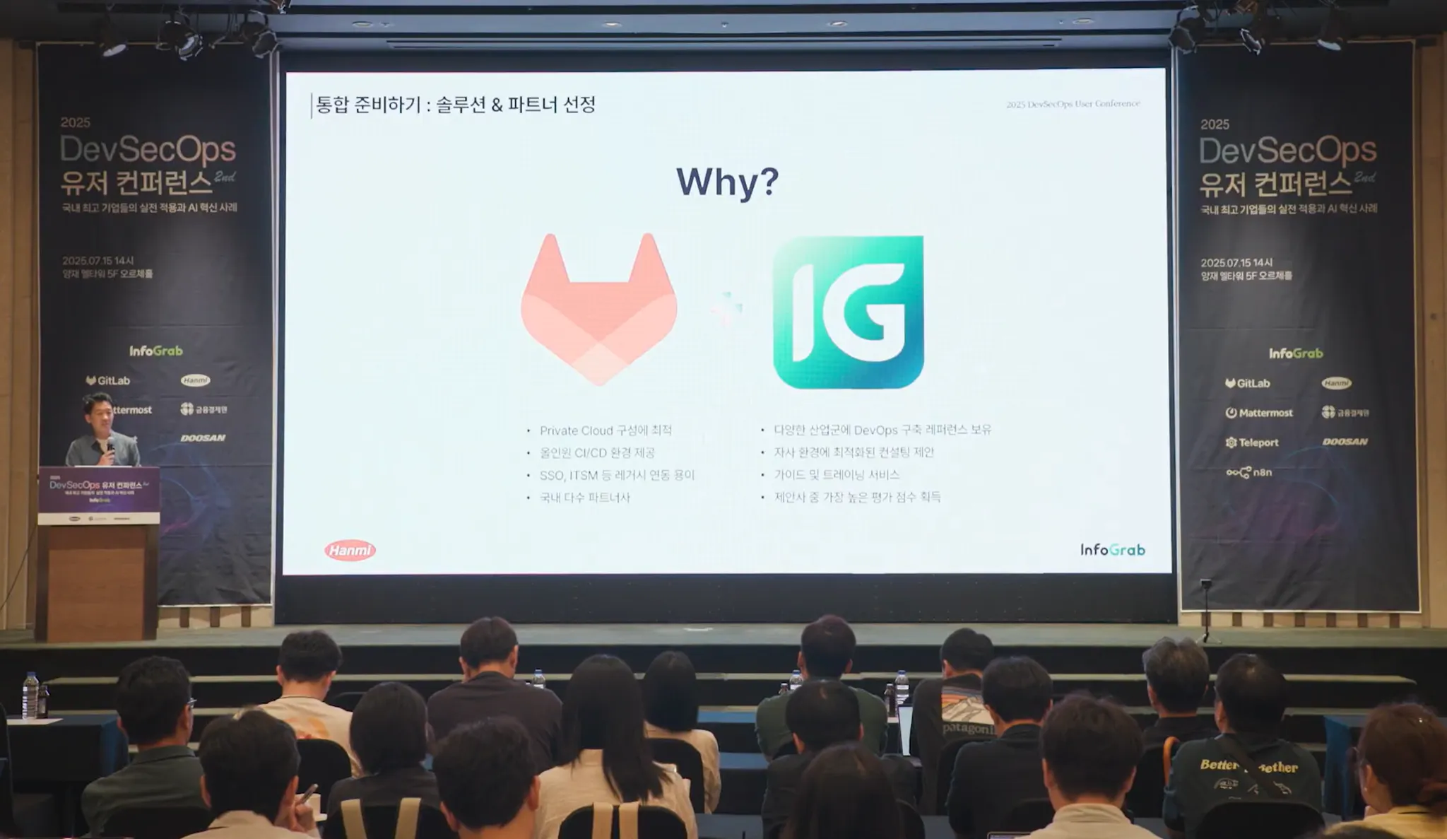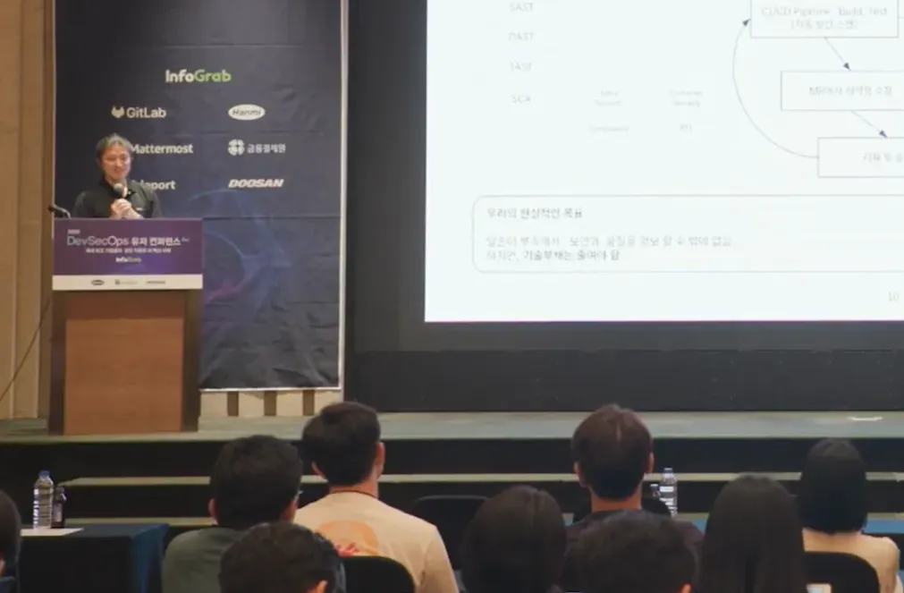 GitLab을 기반으로 레거시 시스템을 연동하고, 자동화와 품질 개선까지 이뤄낸 과정을 구체적으로 소개해주셨습니다. 실제로 한미사이언스에서 구현한 DevOps 아키텍처까지 공개해주셔서, 현장에 계신 분들 모두 많은 인사이트를 얻으셨을 것 같습니다.