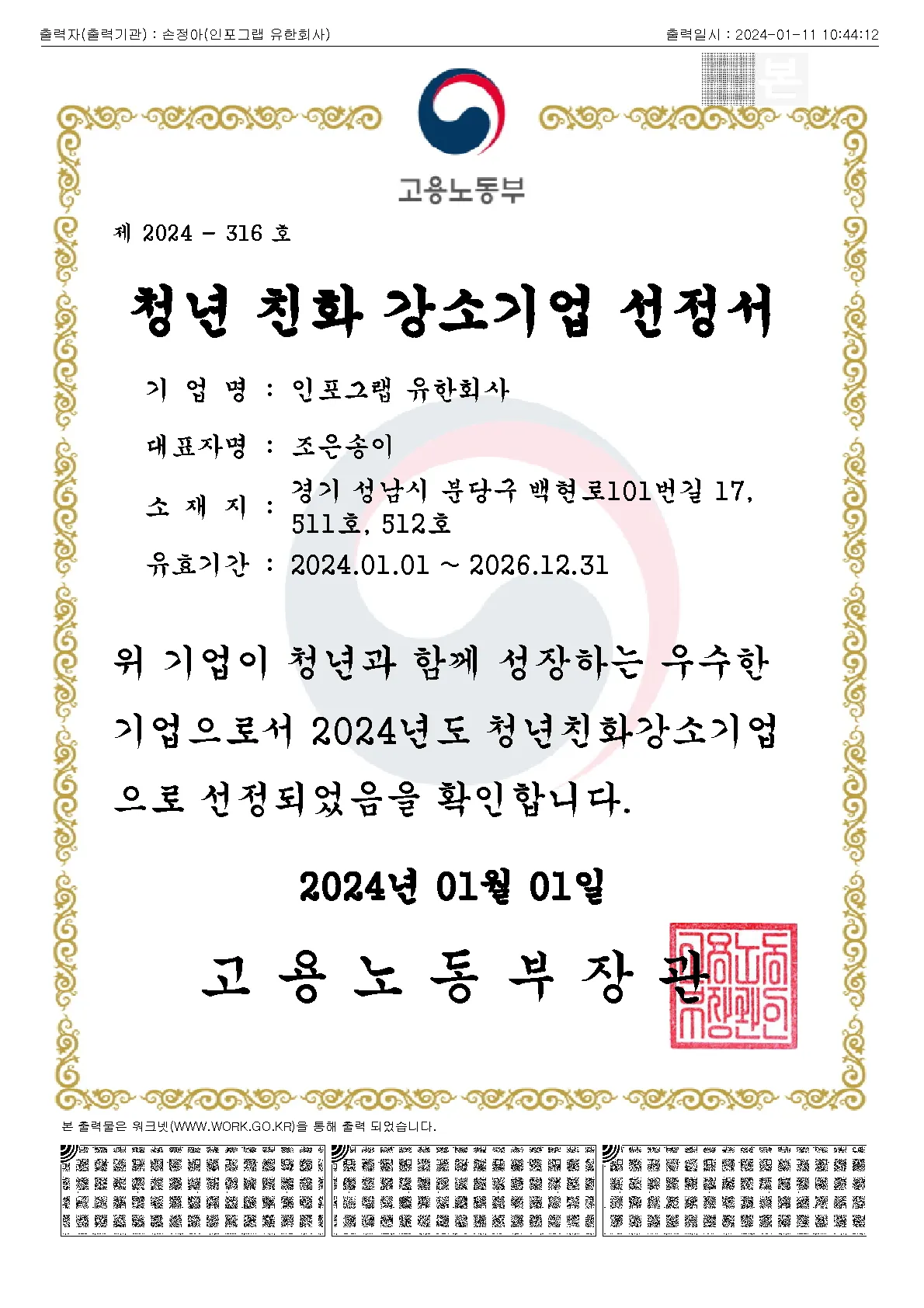 인포그랩이 “청년친화 강소기업”으로 선정되었습니다!