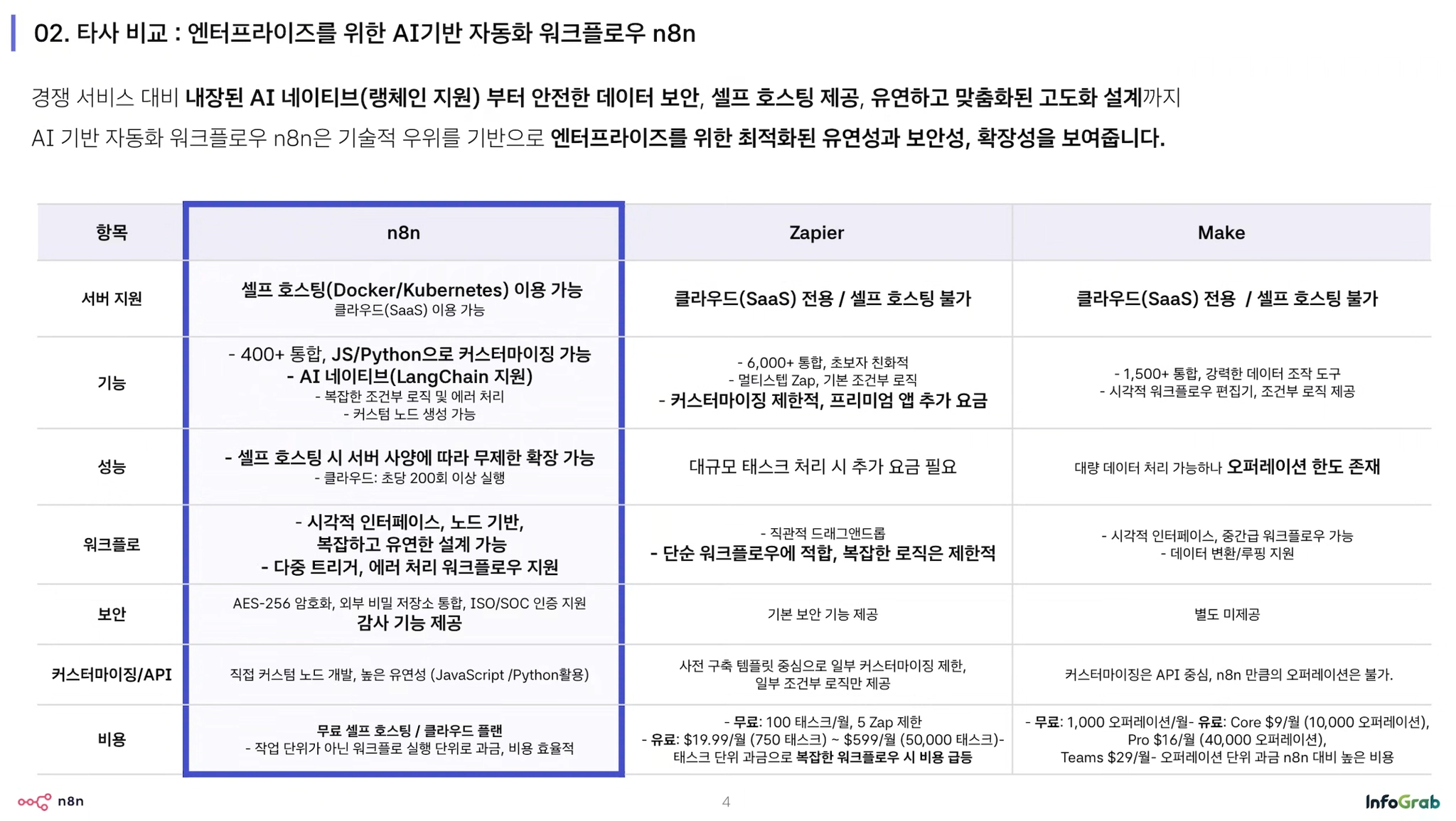 커스터마이징 자유도도 눈에 두드러지는 특징인데요. n8n에서는 코드 노드로 JavaScript나 Python 로직을 직접 작성할 수 있고, 커스텀 노드도 추가할 수 있죠. 이 외에도 Andy는 보안, 비용, 성능 면에 n8n 장점을 비교 표로 정리해 공유했습니다.