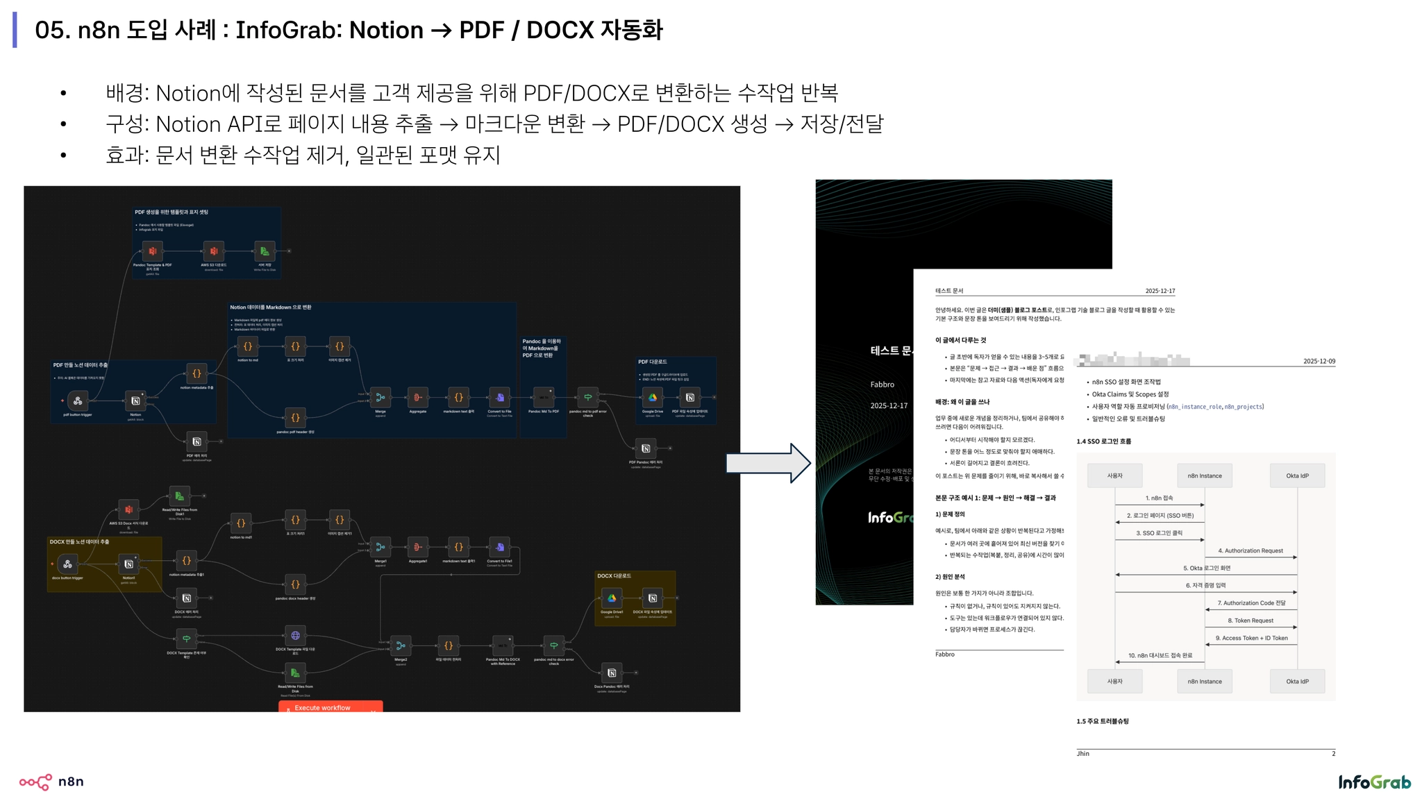 n8n으로 Notion 버튼 클릭 한 번에 브랜드 표지와 커스텀 포맷이 적용된 PDF를 자동 생성하는 워크플로를 구축했습니다. 이로써 수작업 없이 일관된 품질의 문서를 고객에게 바로 전달할 수 있게 됐죠.