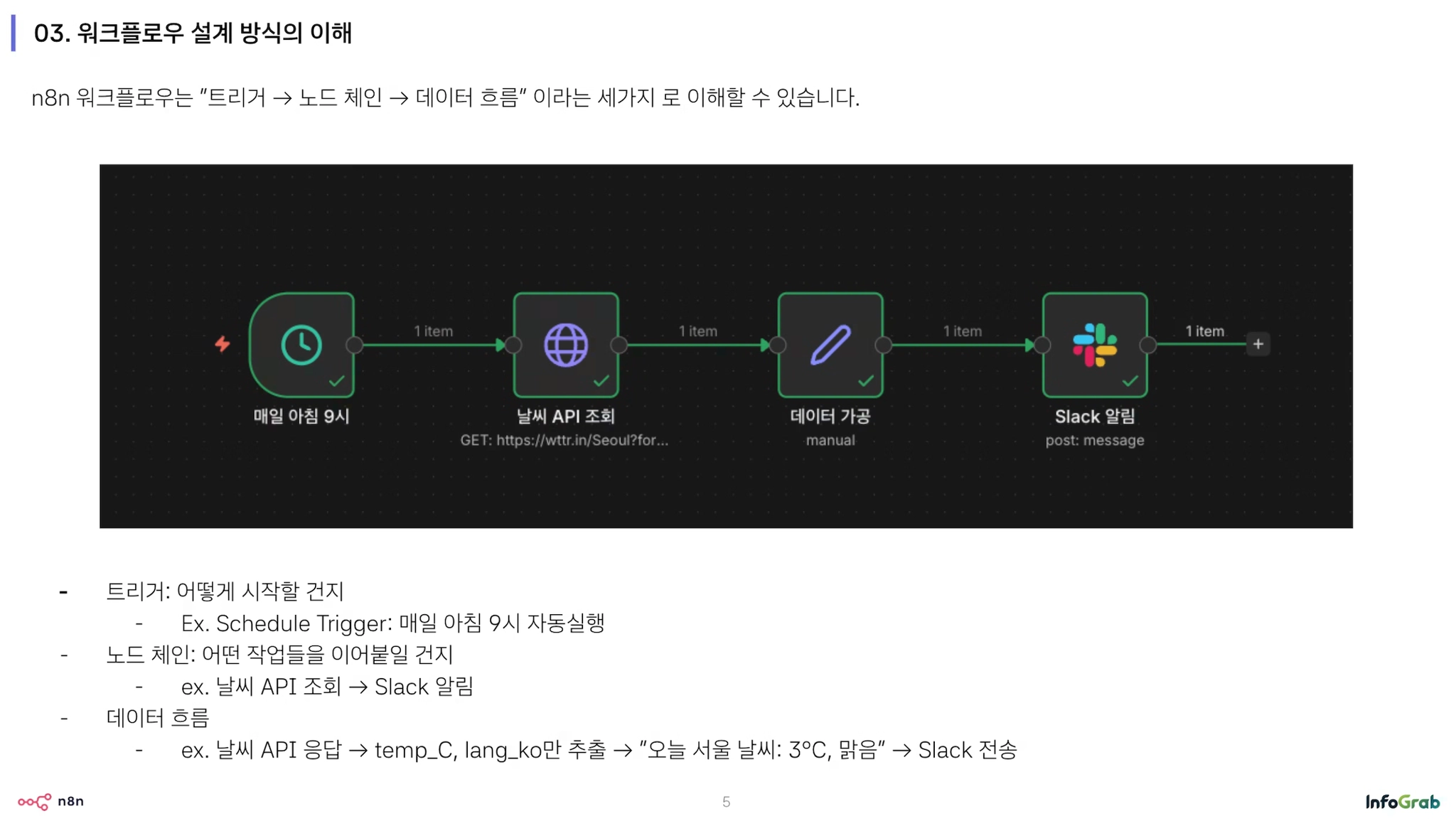 스케줄 트리거로 아침 9시에 실행 → 날씨 API에서 데이터 수집 → 데이터 가공 노드로 온도·날씨 상태 추출 → Slack 메시지 전송. 이 네 단계가 Trigger, Node Chain, Data Flow에 각각 대응하는 구조였죠.