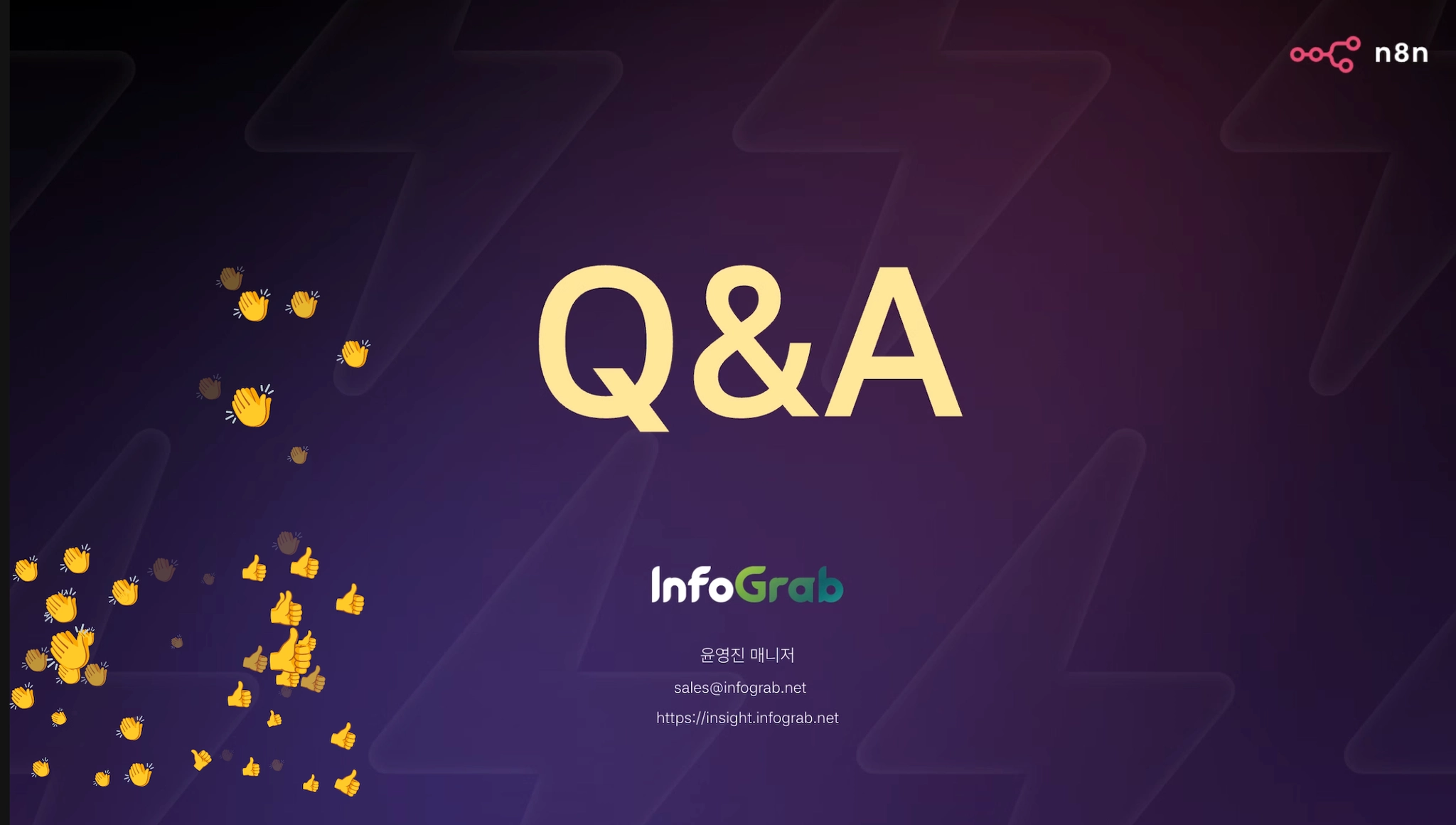 이번 세션에는 약 230명이 참석해 높은 관심을 보여줬는데요. 인포그랩은 n8n이 어떤 플랫폼인지, 기존 자동화 도구와 무엇이 다른지, 실제로 어떻게 활용할 수 있는지를 약 1시간에 걸쳐 소개했습니다.