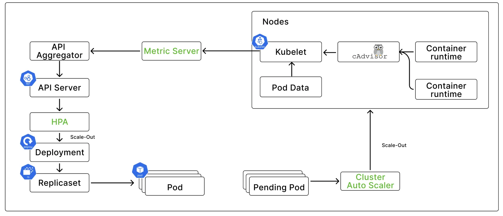 Metrics Server는 클러스터에서 리소스 메트릭을 수집하고 이를 Kubernetes API server에 노출하여 Autoscaler에 포함된 HPA(Horizontal Pod Autoscaler) 및 VPA(Vertical Pod Autoscaler)에서 사용할 수 있도록 합니다. 클러스터 내에 Metrics Server가 없을 경우 HPA, VPA에서 오류가 날 수 있습니다.
