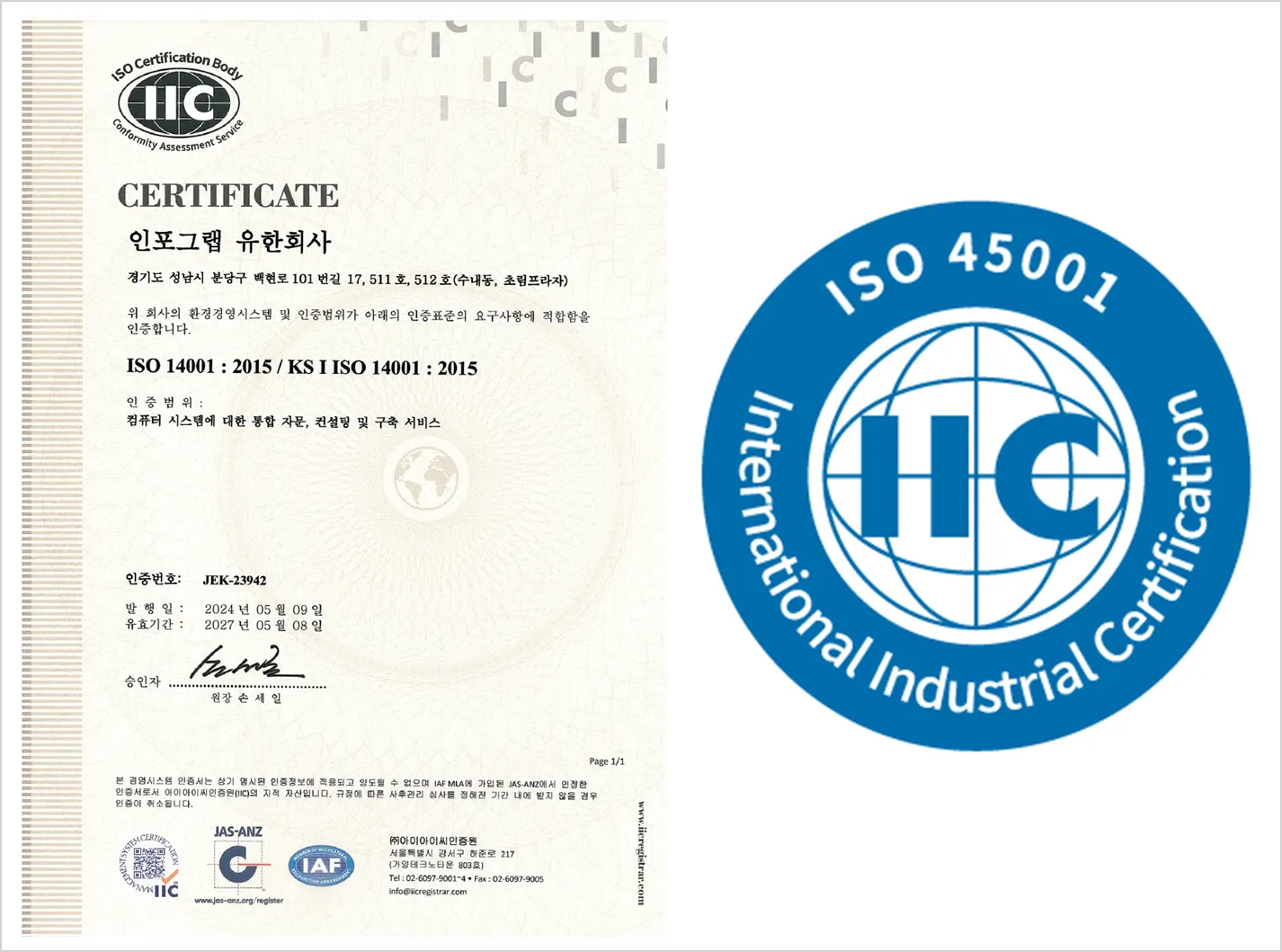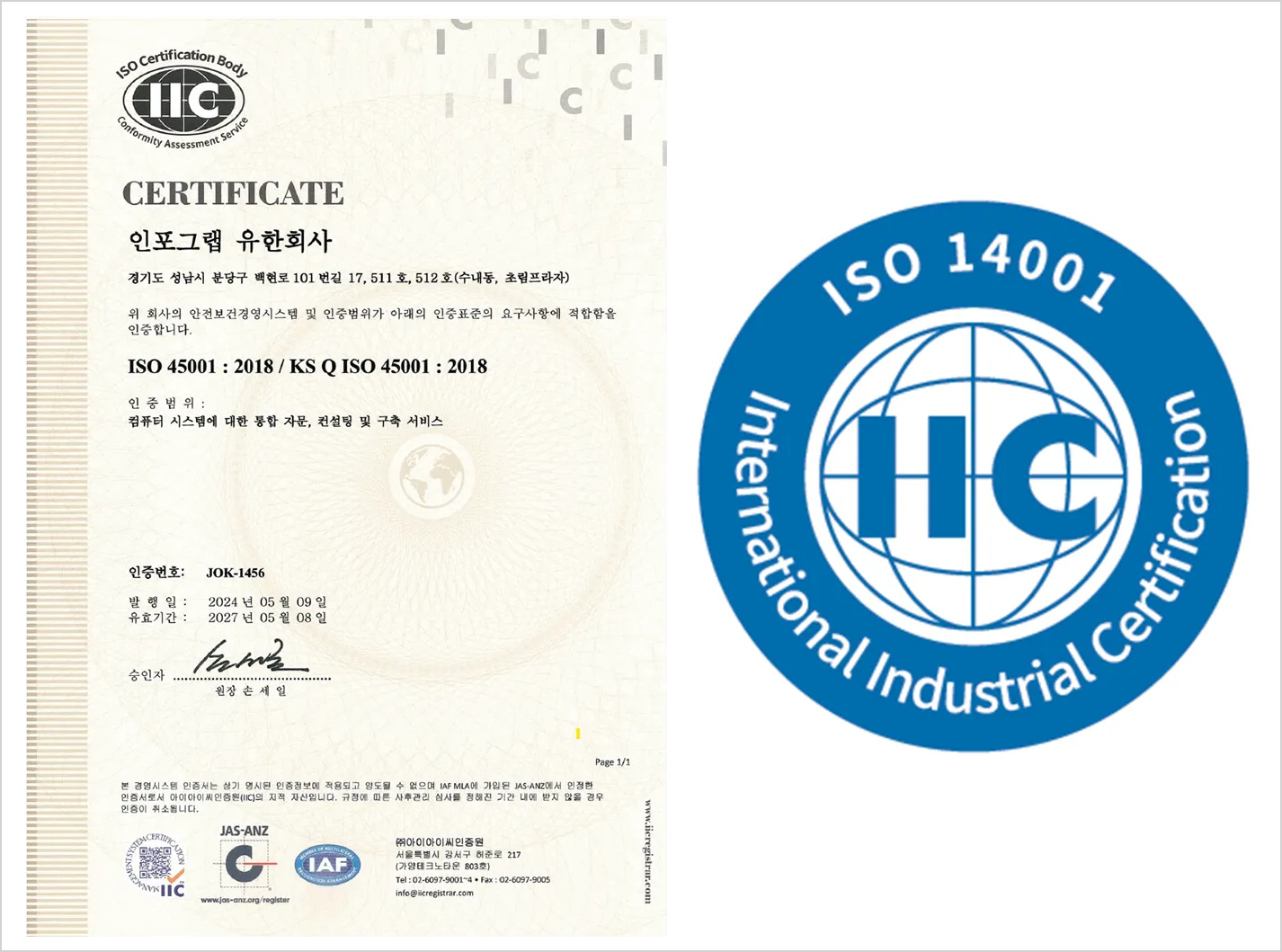 인포그랩은 이번에 9001(품질 경영 시스템), 14001(환경 경영 시스템), 45001(안전보건 경영 시스템)까지 총 3건의 인증을 획득했습니다.