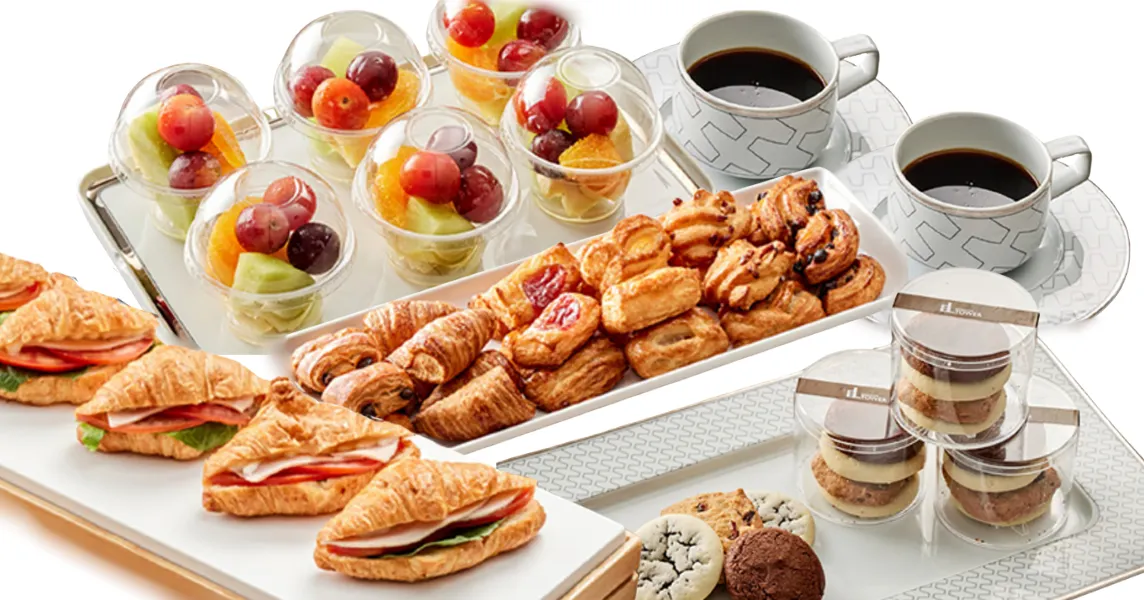 커피, 샌드위치, 쿠키, 과일류 제공